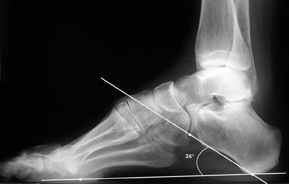 b. Abnormally high calcaneal pitch consistent with pes cavus.