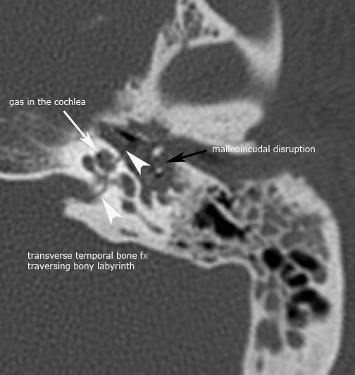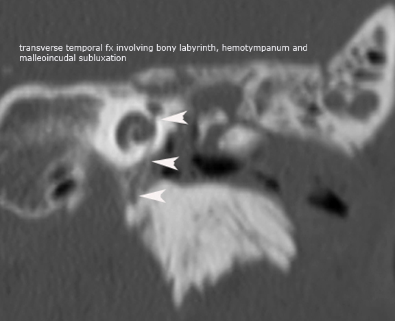 The transverse temporal bone fracture runs perpendicular to the long axis of the petrous bone. The fracture plane typically extends from the jugular foramen and foramen magnum to the middle cranial fossa, commonly passing through or near the vestibular aquaduct with variable involvement of the otic capsule. There are two sub-types of transverse temporal bone fractures relative to the arcuate eminence, medial and lateral transverse fractures, both of which frequently result in sensorineural hearing loss (SNHL). The medial sub-type traverses the fundus of the IAC and SNHL is variabe but can be complete due to transection of the cochlear nerve. The lateral sub-type traverses the bony labyrinth resulting in SNHL and may also have an associated perilymphatic fistula due to stapes footplate injury.